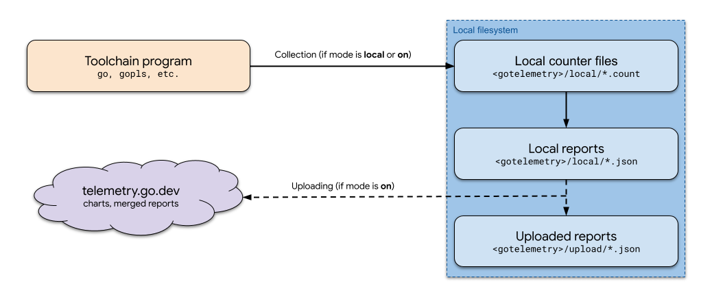 • Reports are aggregated summaries of counters for a given week. If uploading is enabled (the mode is on), reports for approved counters are uploaded to telemetry.go.dev, where they are publicly accessible.